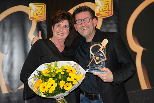 Michel en Monique ontvingen de Bronzen Schieter uit handen van de directeur van het Echte Bakkersgilde Geert Caniels in bijzijn van een grote groep collega Echte Bakkers die voor de bijeenkomst naar Kesteren waren gekomen.